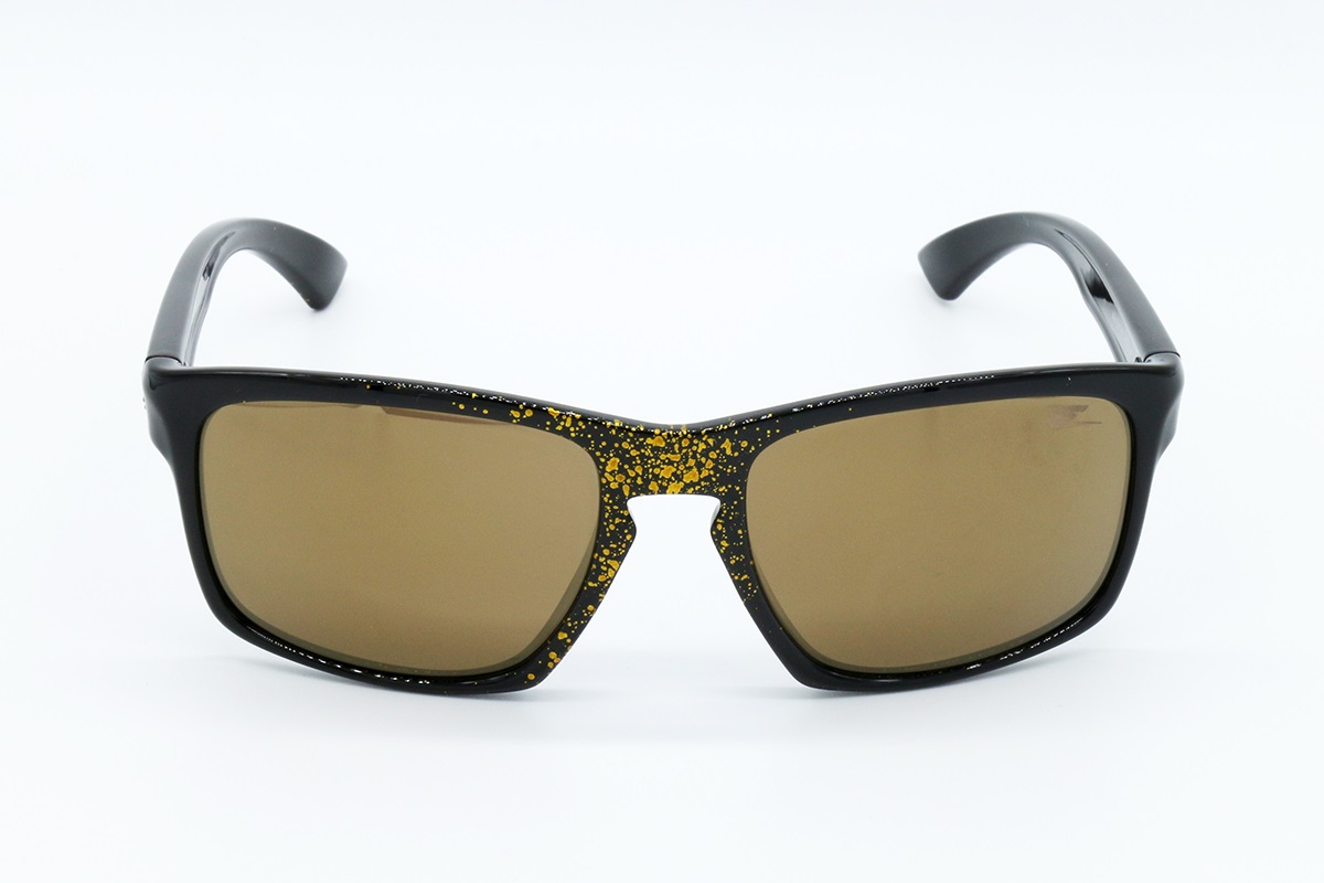 GLASSES WITH SHINY BLACK BASE, GOLD SPRUZZI IN THE CENTRAL PART AND FINLA OF THE RODS, GOLD MIRRORED LENSES.