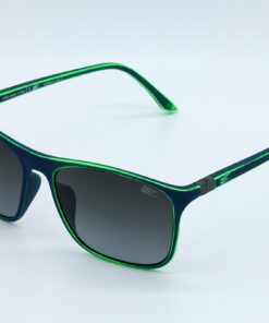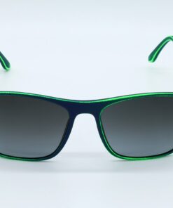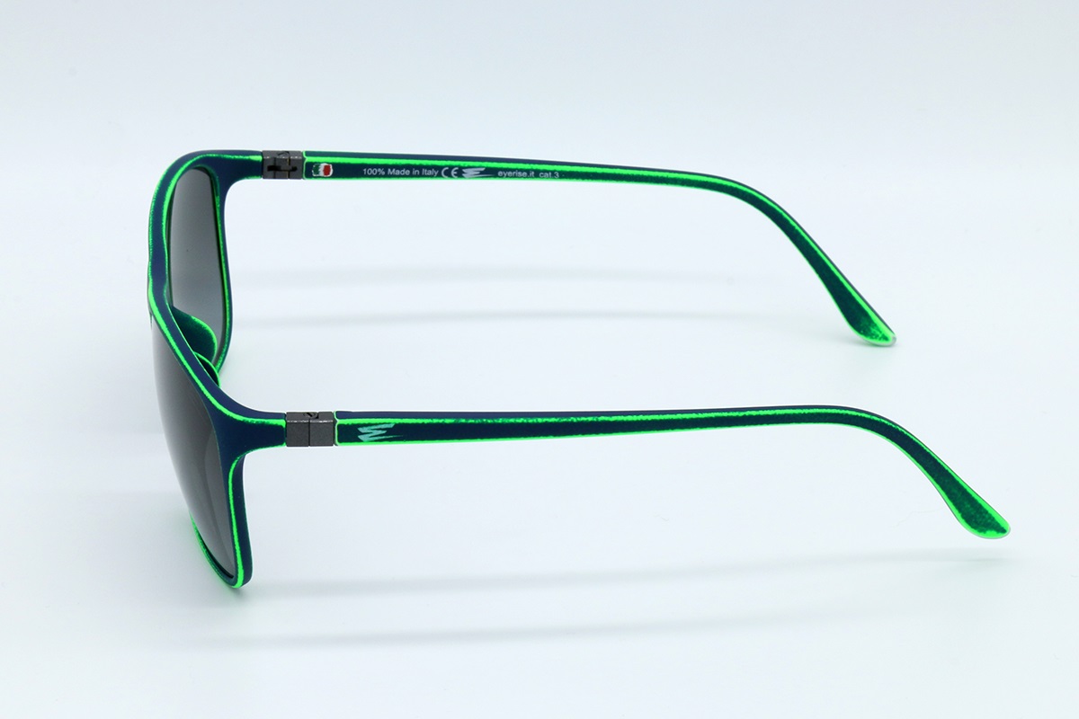 Glasses with dark blue base, aged fluo green, rubberized paint and steel rods. Two-colored lens.