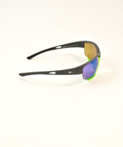 The frame is yellow fluo with a semi-transparent effect. The final part of the temples is rubberized and black. The lenses are green and mirrored. .