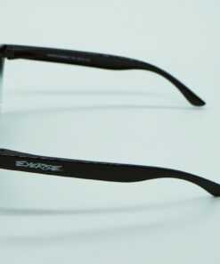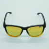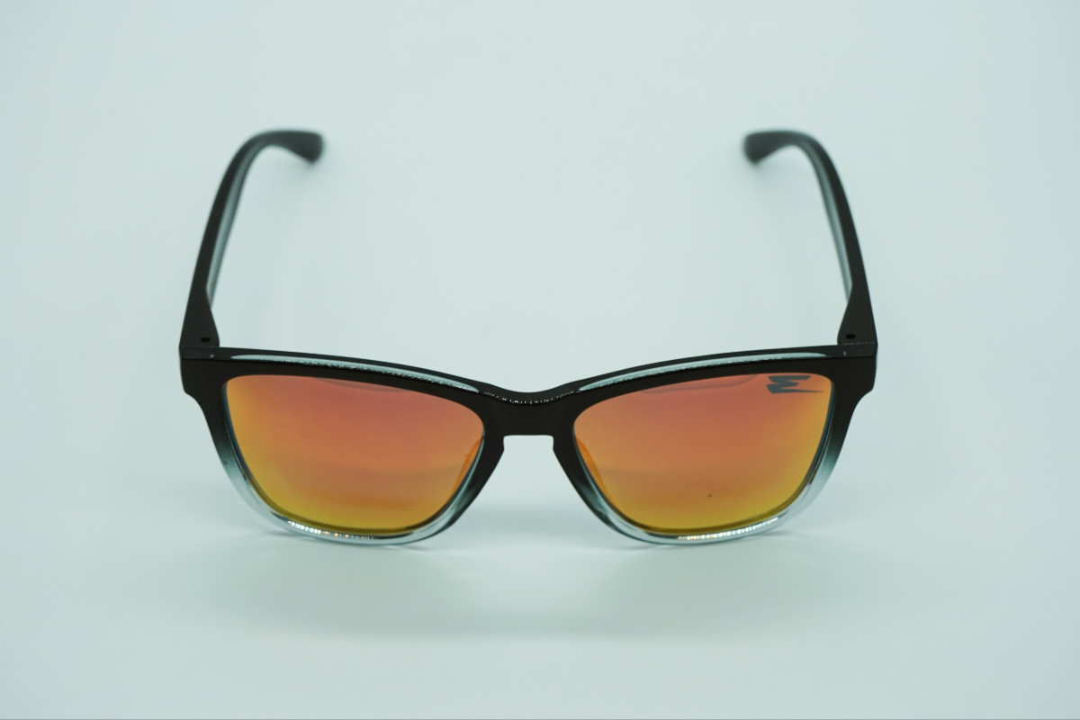 Occhiale bicolore lucido, basso frontale argento semitrasparente, lente specchiata arancio polarizzata.