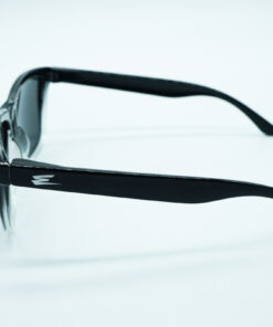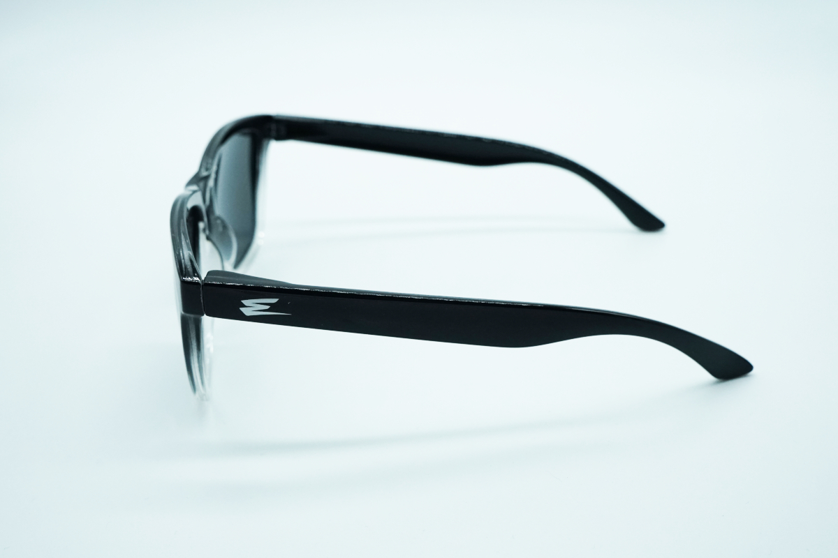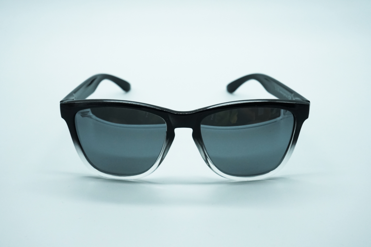 Occhiale bicolore lucido, basso frontale argento semitrasparente, lente mirror polarizzata.