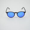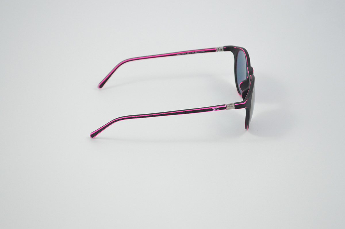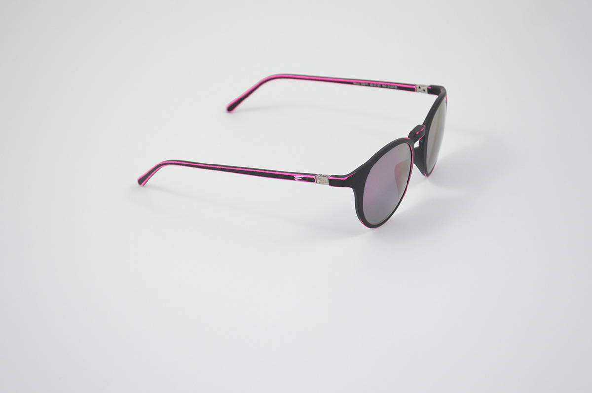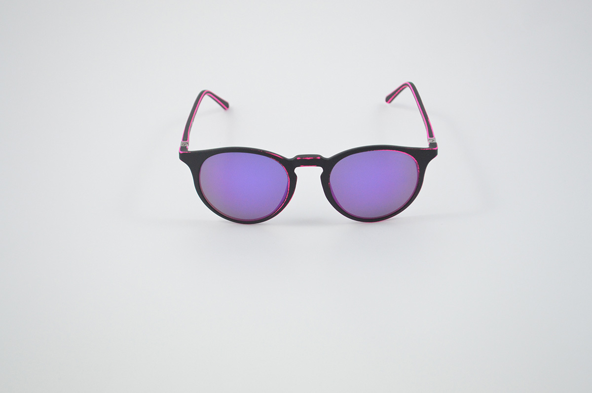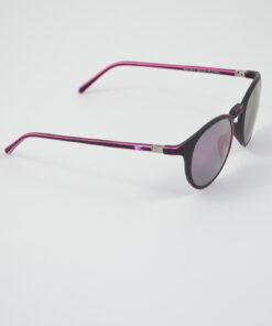 Pantos sunglasses with an opaque black base. Moreover it has an aged effect in purple fluo, steel hinges and mirrored purple lenses.
