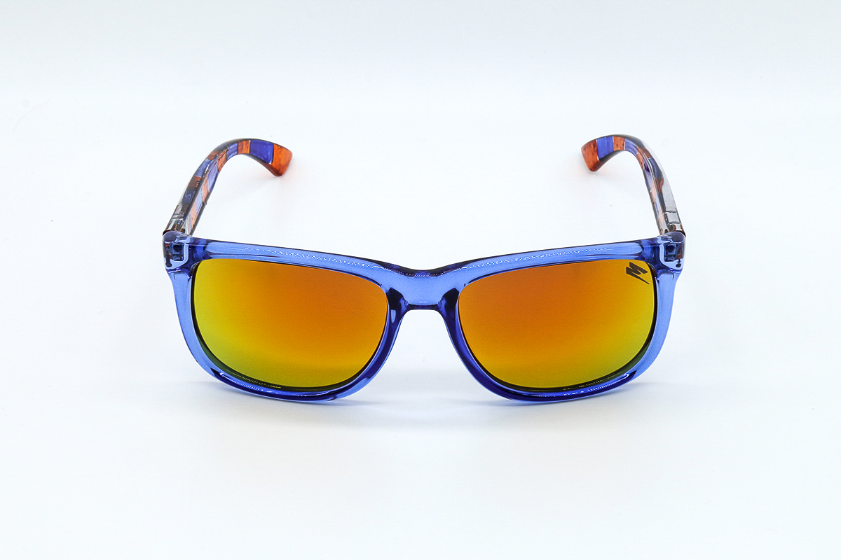 BLUE OPAQUE COLORED GLASSES ON THE FRONT, YELLOW POLISHED ROD WITH SOME signs of RED SPRAYS, MIRRORED YELLOW LENSES.
