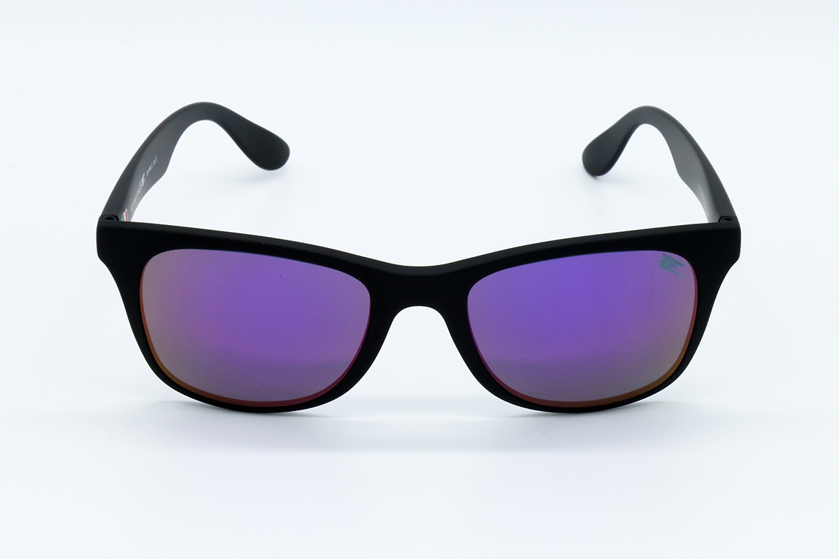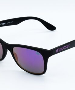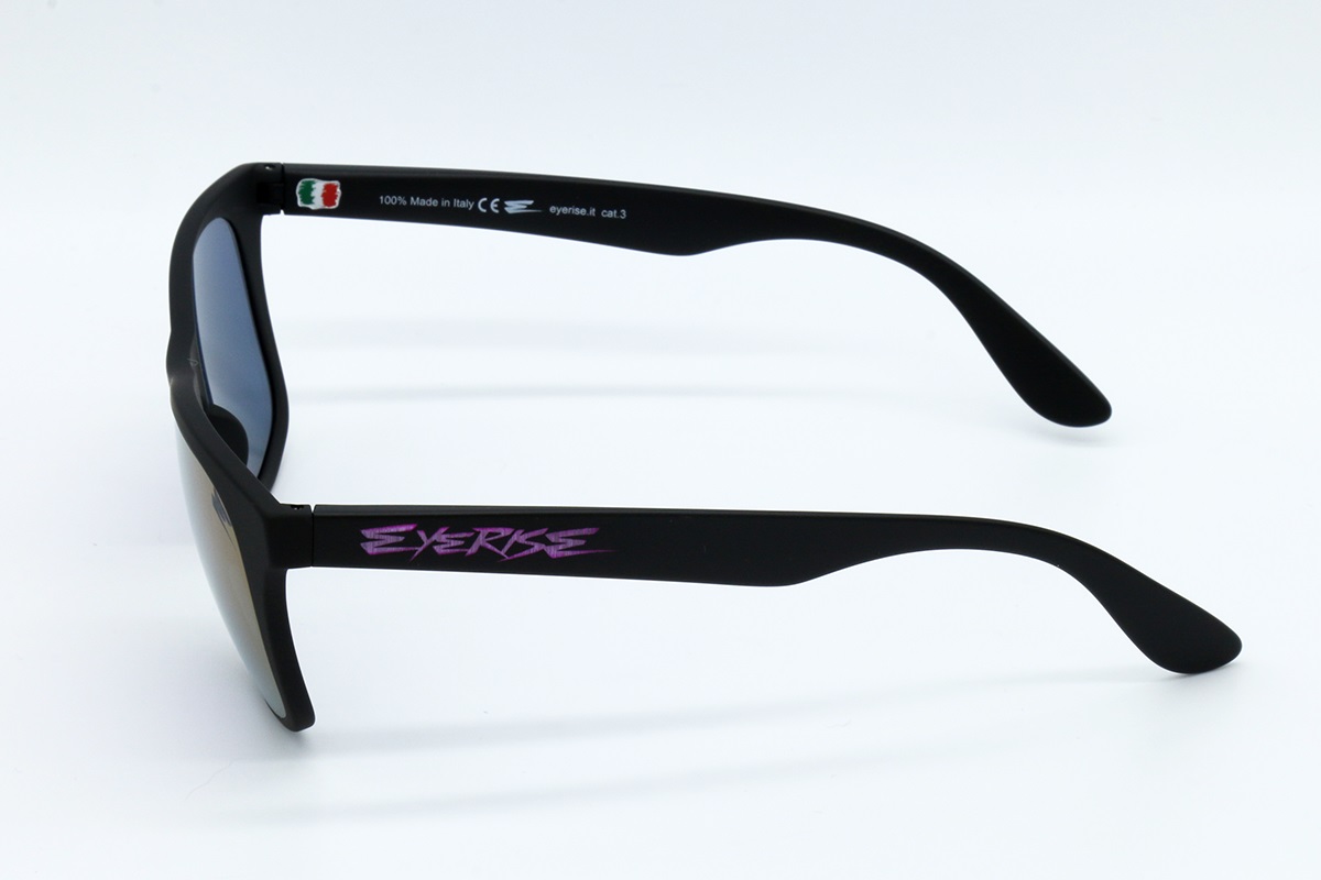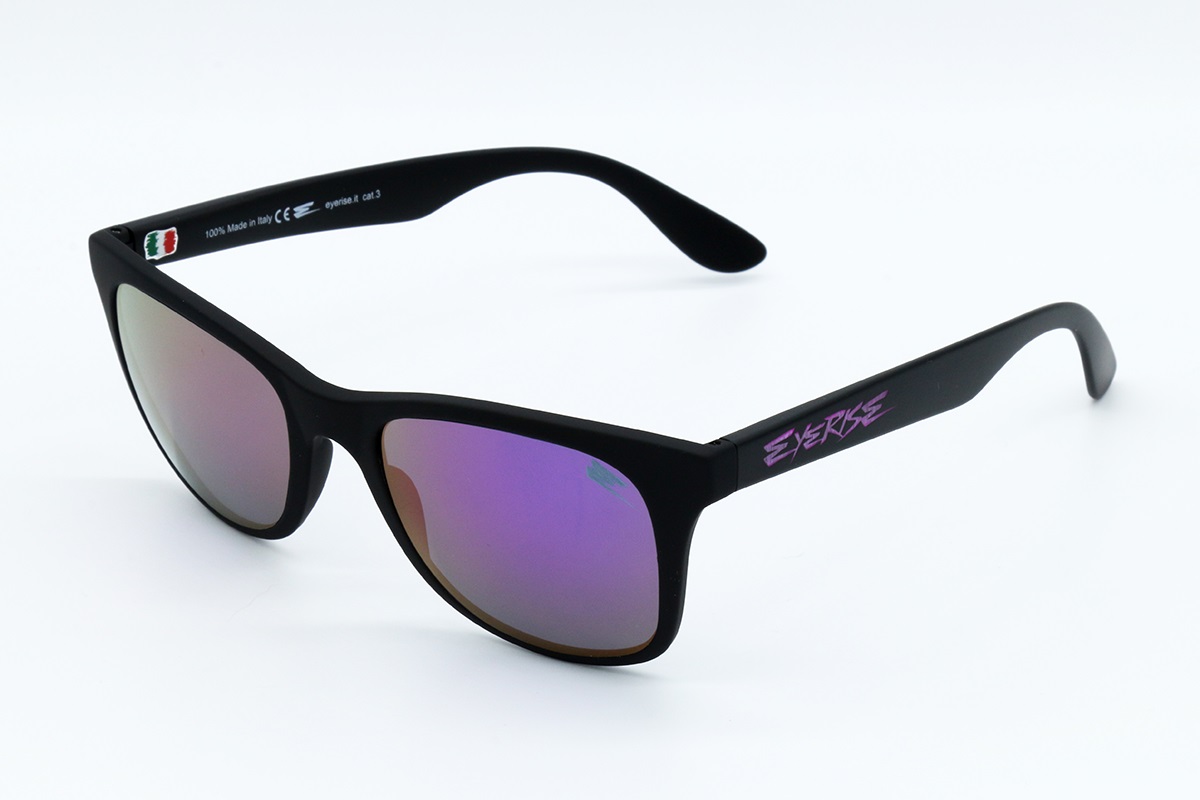BLACK RUBBER GLASSES WITH PURPLE EYERISE LASERATE AND PURPLE MIRROR LENS.