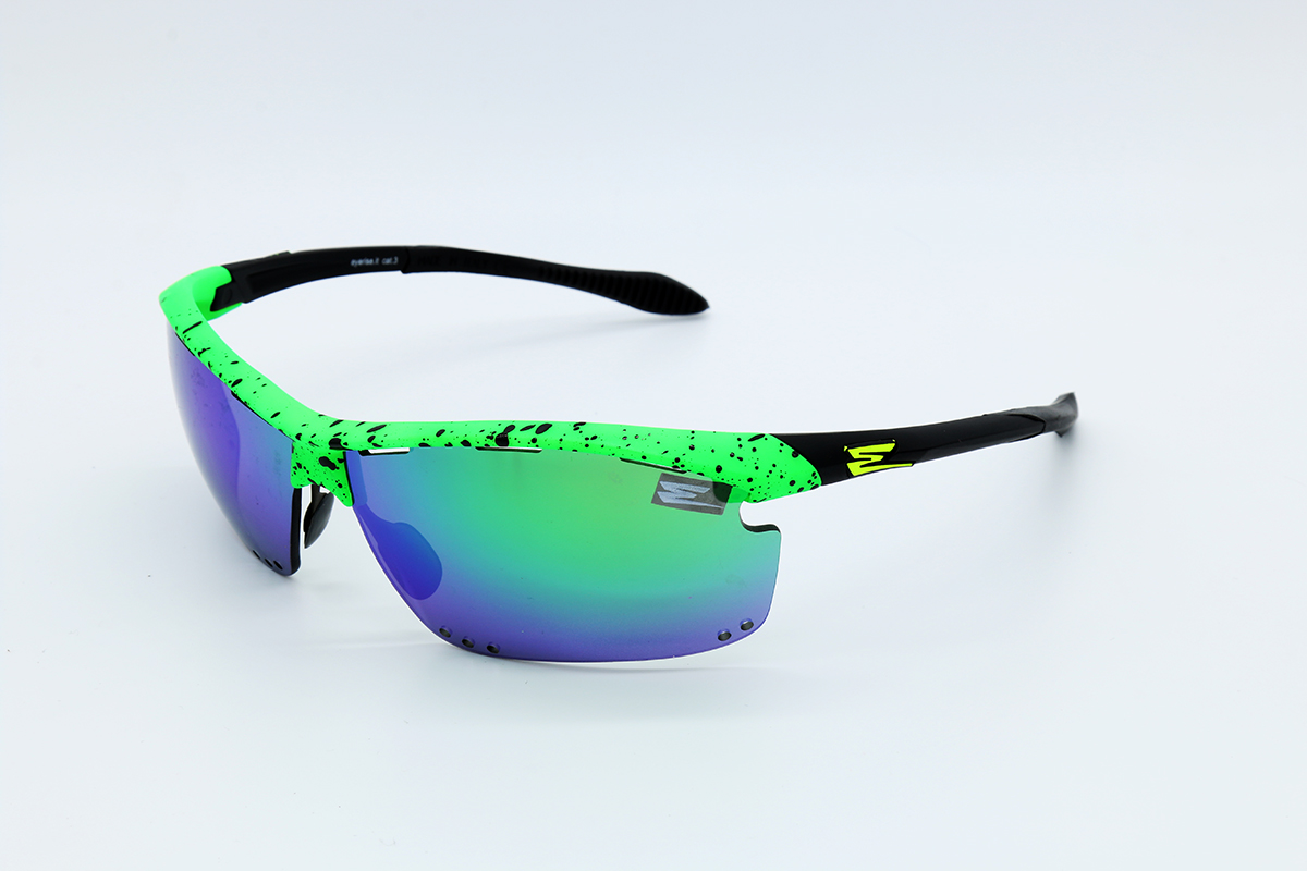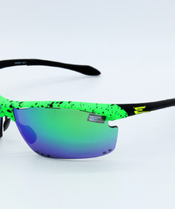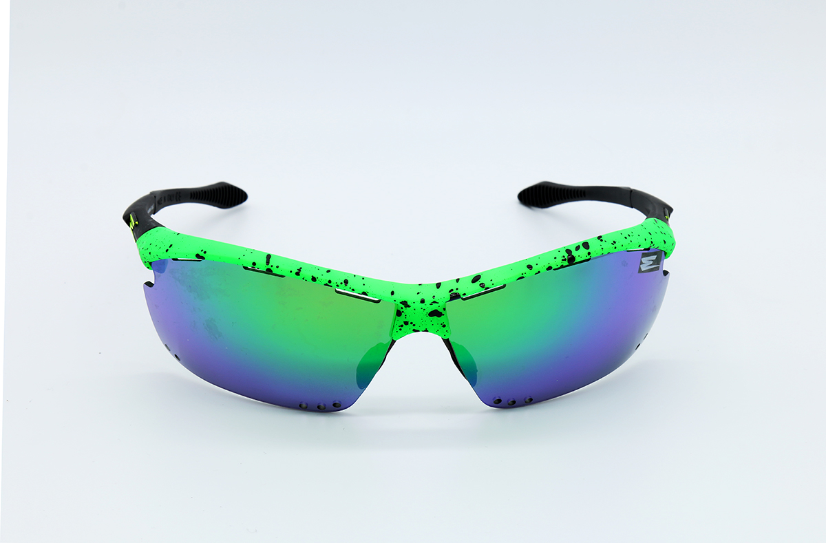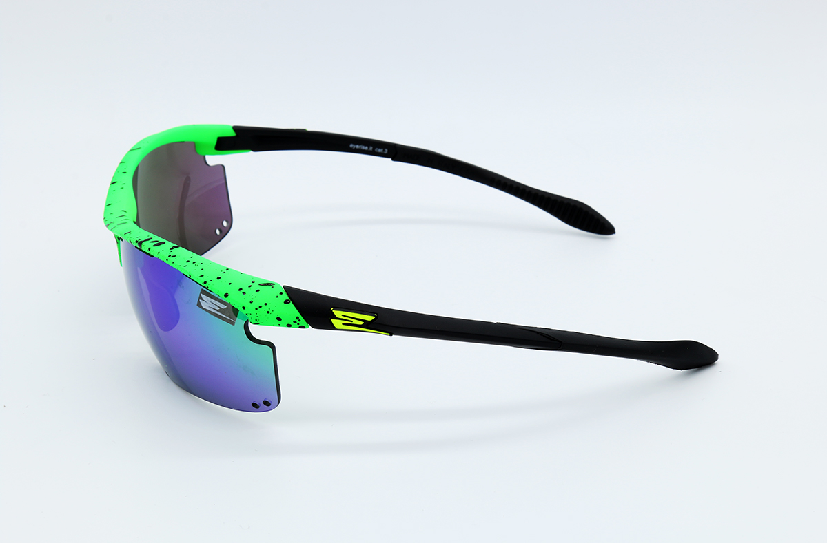 BASE COLOR GREEN FLUO WITH DROPS IN BLACK RELIEF, LENSES MIRRORED IN THE COLOR IN THE BASE, FINAL PART OF THE RUBBER AUCTION AND ADJUSTABLE NOSE WITH RUBBER SUPPORT.