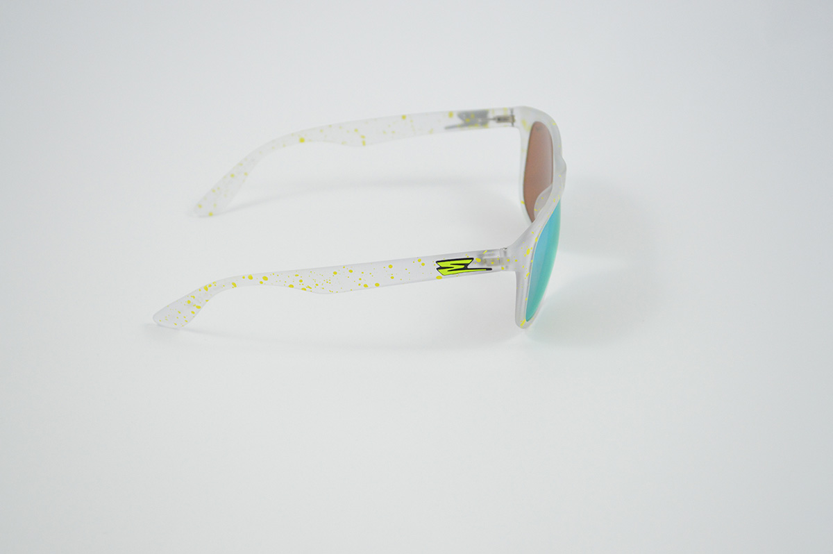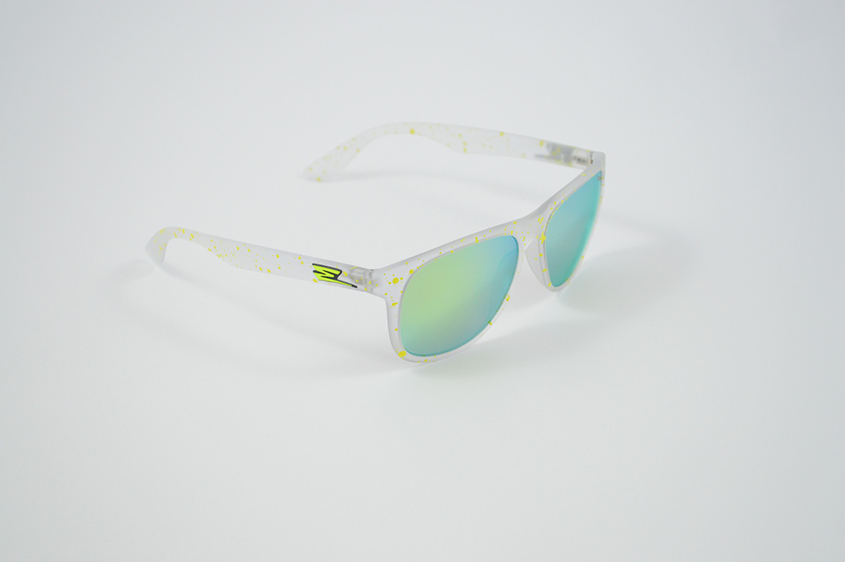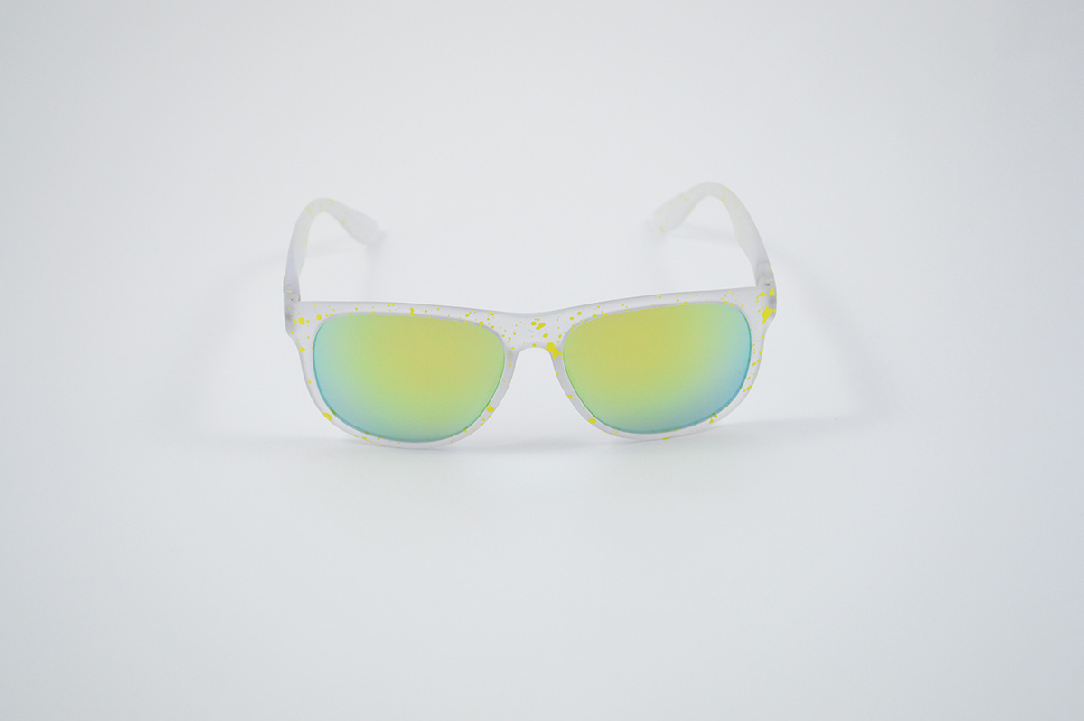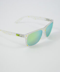 Sunglasses with a frosted base, green embossed drops with green mirrored lenses.