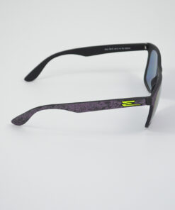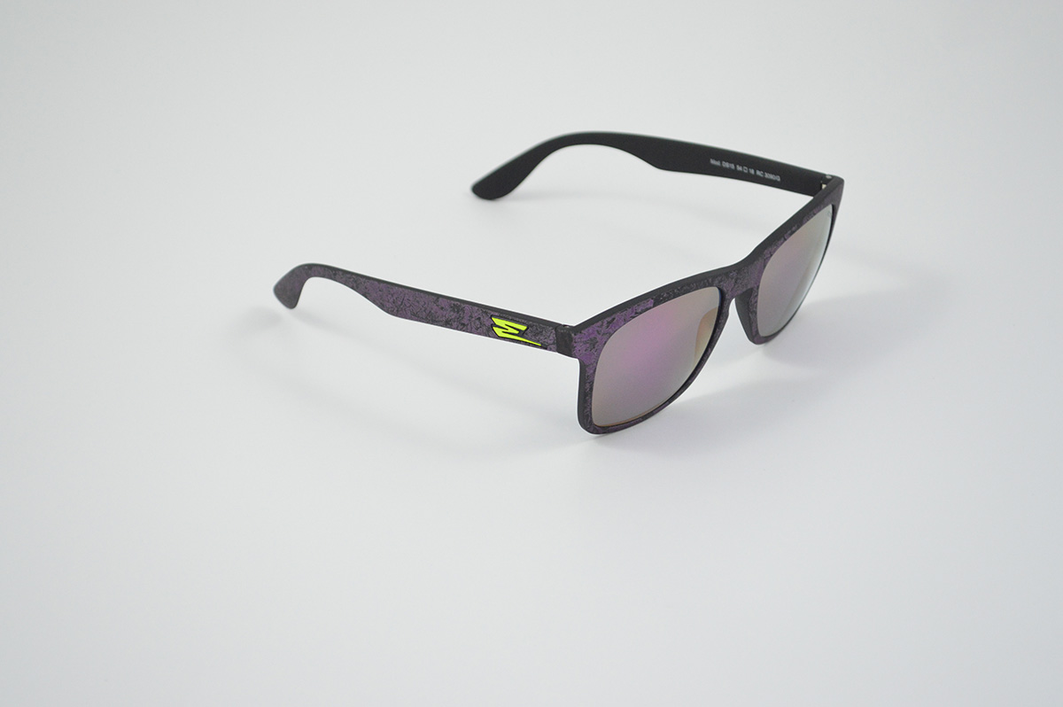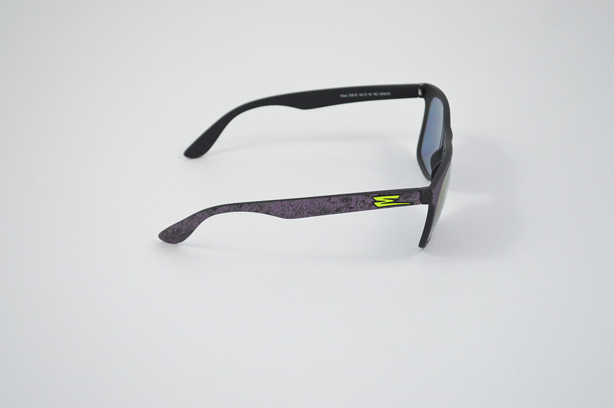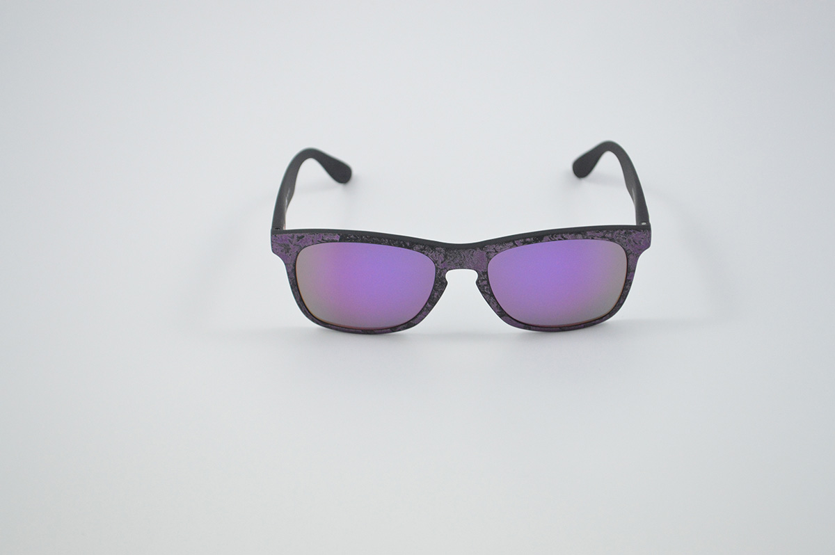 Sunglasses with an opaque black base, purple “sponge” effect, purple mirrored lenses and flex hinges.
