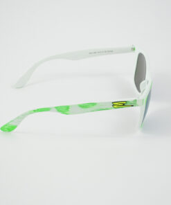 Sunglasses with a white base, green fluo scratchy effect, and green lenses