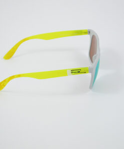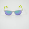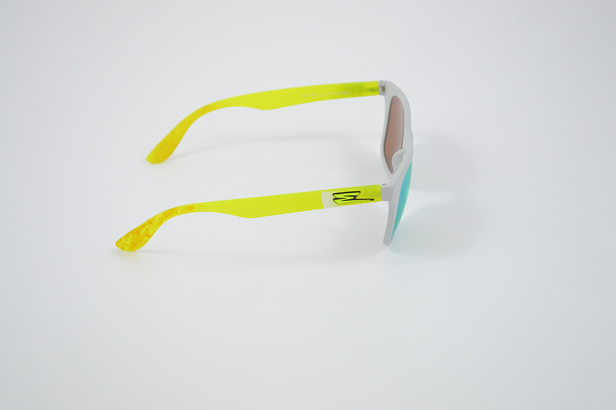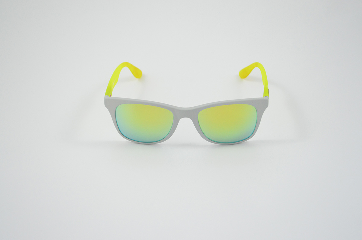 Sunglasses with 2 color, the frontal part is rubberized in opaque grey color, the frosted temples are yellow with white shades and sponged on the final part. The lenses are yellow and mirrored.